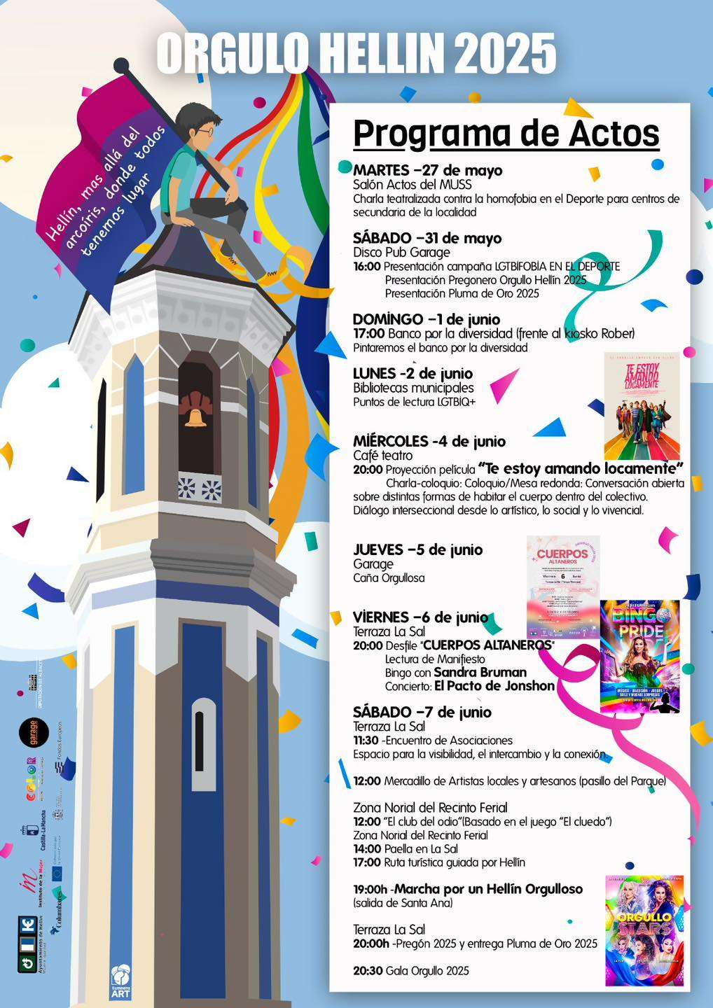 Durante esta conmemoración focalizamos las actividades en temática social son de interés para el Colectivo LGTBI, para ello y siempre bajo la premisa de potenciar actividades didácticas y educativas contamos con la colaboración de la Asociación Color Hellín, a quienes, tenemos que agradecerles el trabajo realizado durante estos días dentro de esta semana conmemorativa. De hecho, el cartel anunciador del Orgullo 2025, ha sido diseñado por Emilio Pinar, vocal de la Asociación Color Hellín, el cual, también será nuestro pregonero del Orgullo 2025 que, junto a nuestra Pluma de Oro, Javier Moreno precursor de la fiesta del Orgullo de nuestro municipio se convertirán en nuestras personas referentes durante esta conmemoración.