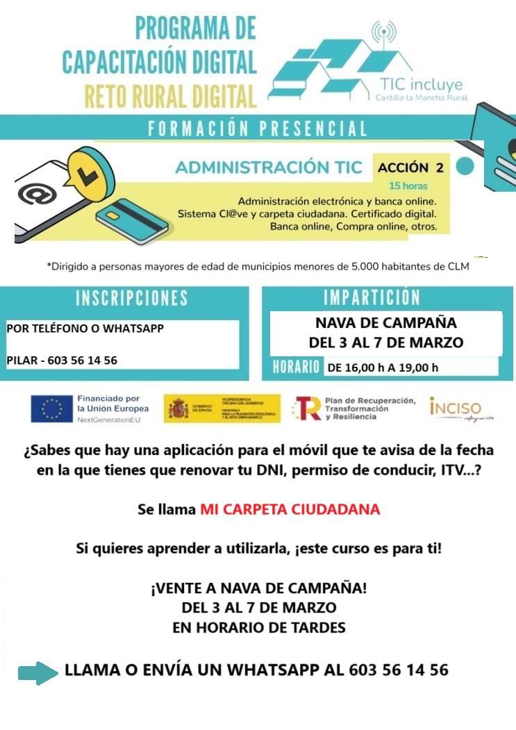 Inciso Integración, en colaboración con el Ayuntamiento de Hellín, organiza un curso gratuito sobre nuevas tecnologías llamado Administración TIC. Tendrá su primera parada en Nava de Campaña entre los días 3 y 7 de marzo en horario de 16:00 a 19:00 en el Centro Social.